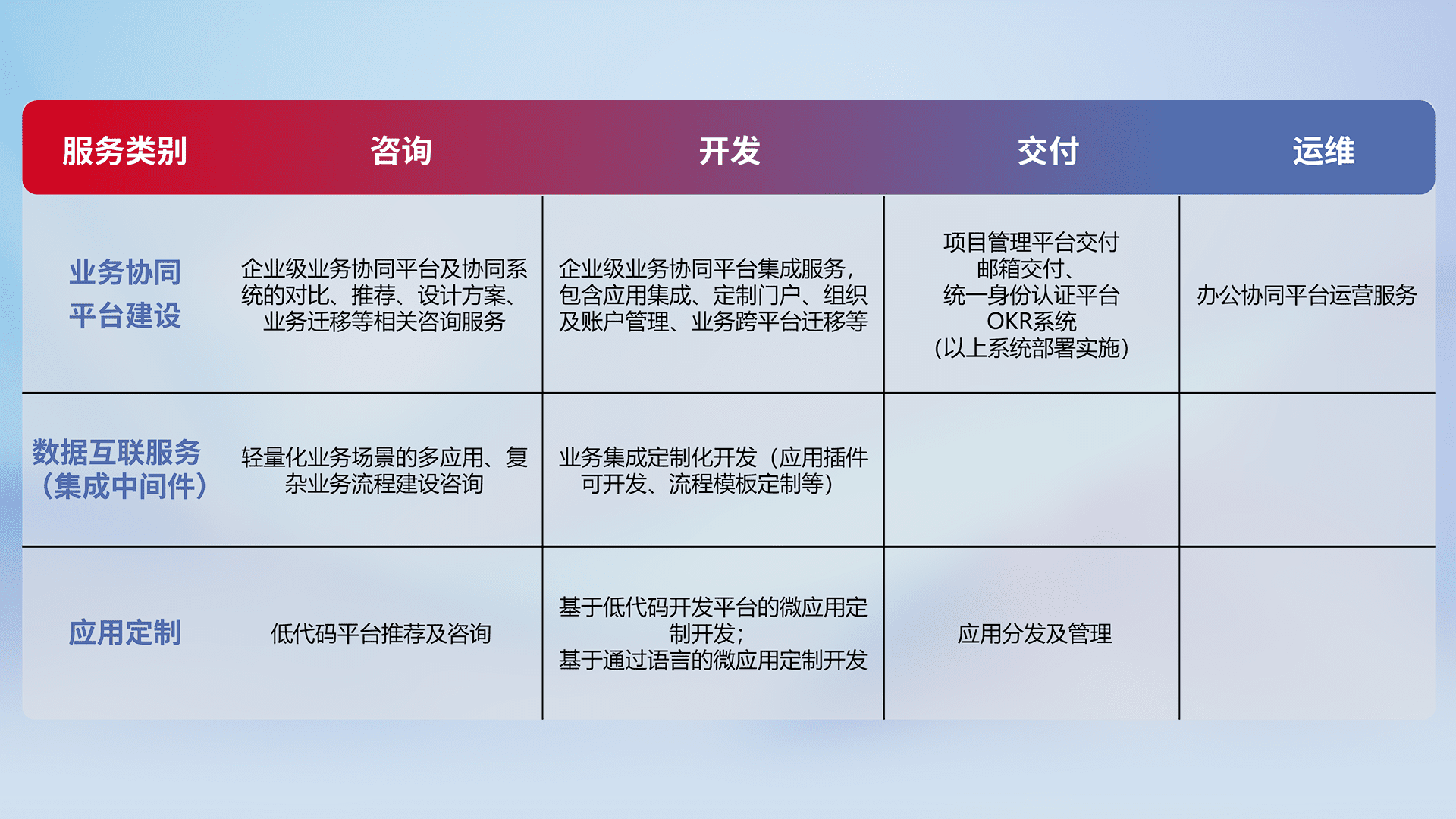 针对钉钉、、企微、、、IDaas等平台级产品提供产品的规划、、、方案、、交付、、、、定制化开发等服务,,,实现如统一协同办公、、、智能客户服务、、混合会议管理、、智能数据查询、、、等业务场景,,,,实现数字化转型。。。